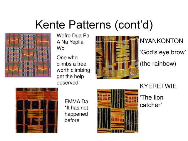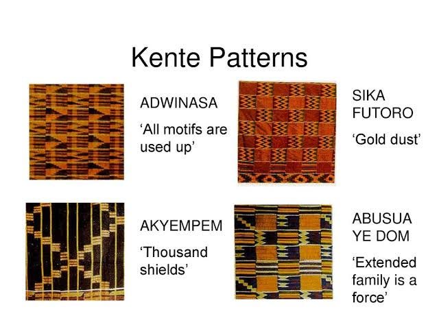 the Kente’s symbolises more than just being a traditional wear , it symbolises the history and values of the Ghanaian people . It also symbolises wealth and royalty, the colours on the kente have different representations . Yellow represents things that are holy and precious. Red represents strong political and spiritual feelings. Green represents growth and good health. Black represents strong spiritual energy and the spirit of one's ancestors.
